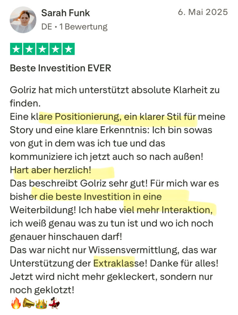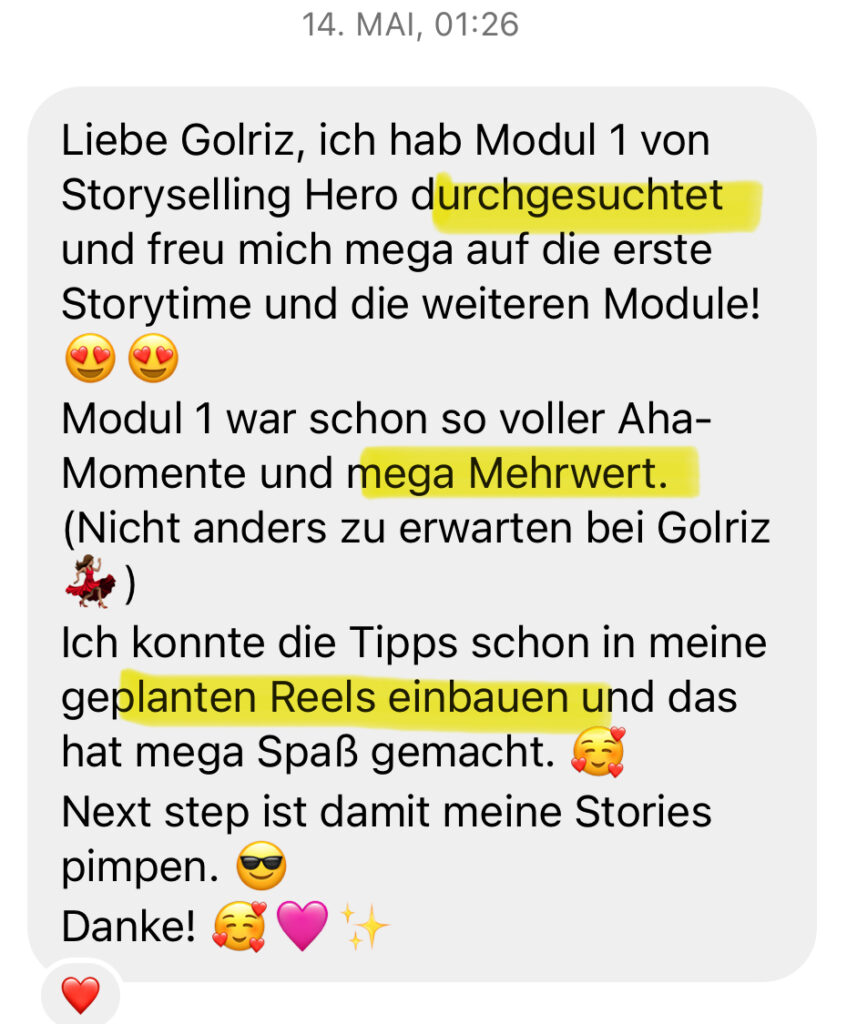 Aber Achtung: Sie geht tief in Verkaufspsychologie, Framing und Sprache rein, weil sie das komplette Wissen von Storyselling Hero drauf hat.