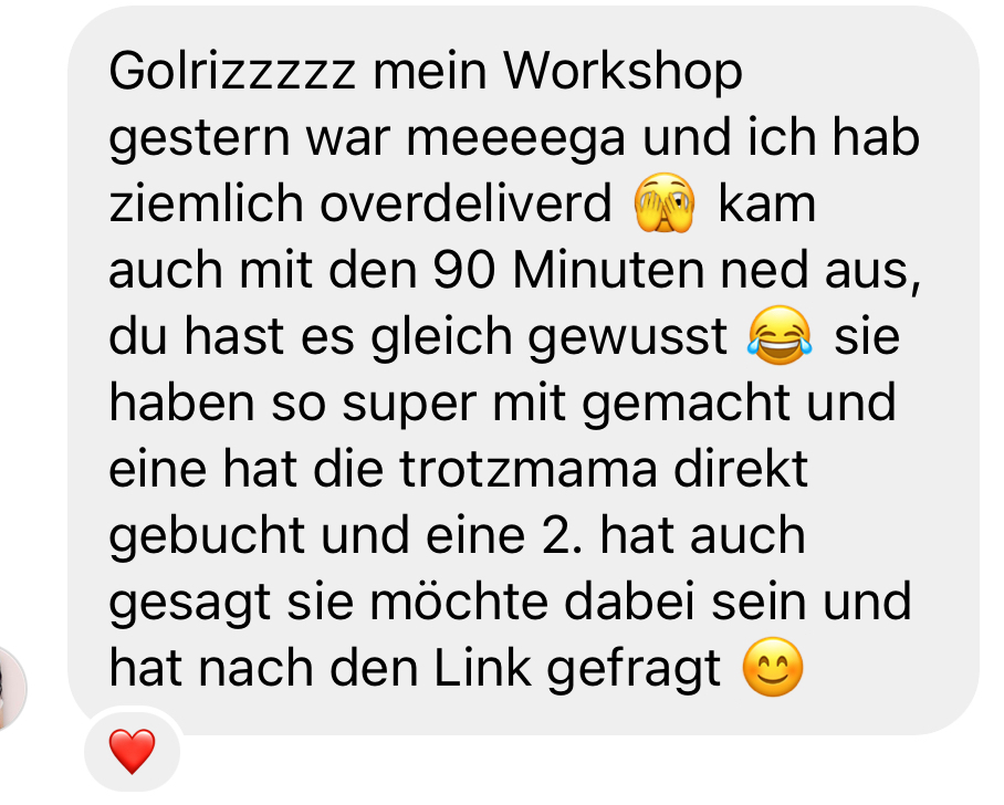 Dann melde dich jetzt an und ich zeige dir in 10 Tagen, wie du Workshops machst, die nicht nur begeistern, sondern auch verkaufen.